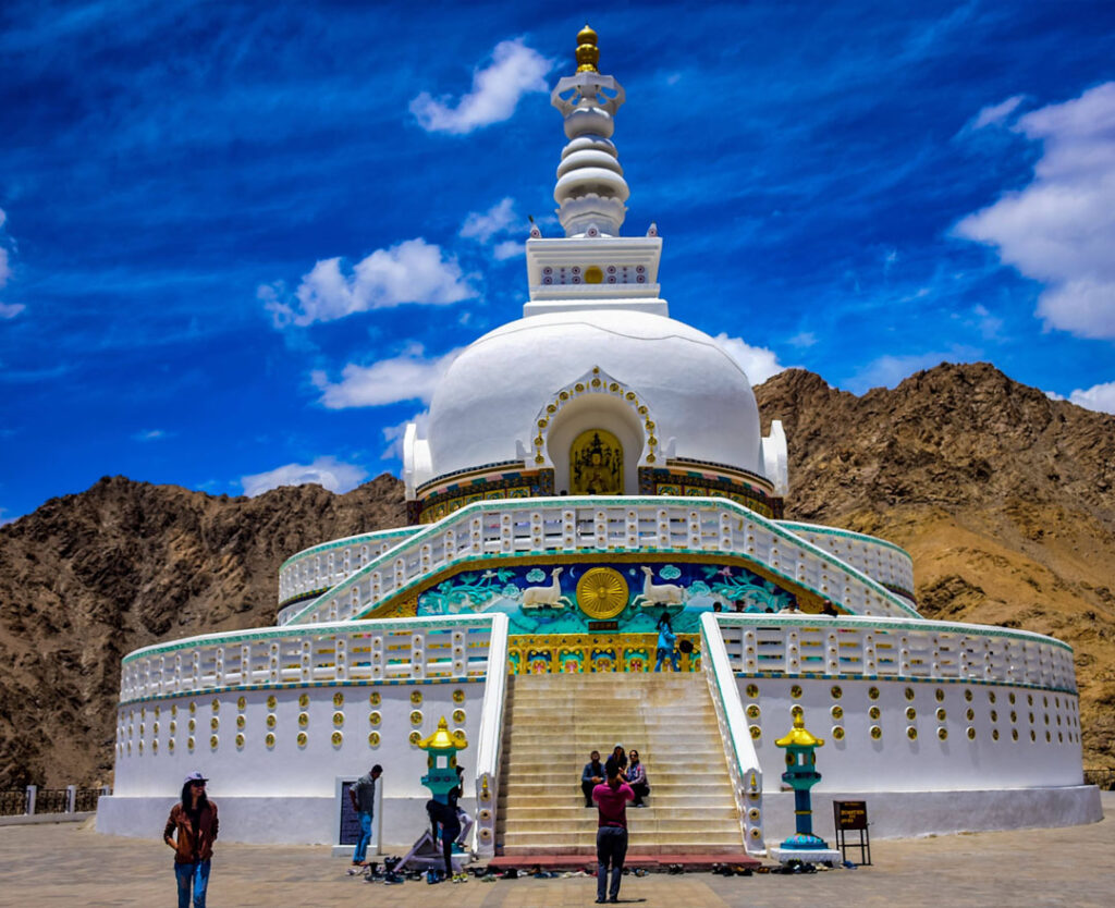 2. Shanti Stupa Ascend to Shanti Stupa, a white-domed Buddhist stupa perched on a hilltop. Witness panoramic views of Leh town and the snow-capped Himalayas, while soaking in the tranquil ambiance and spiritual vibes.